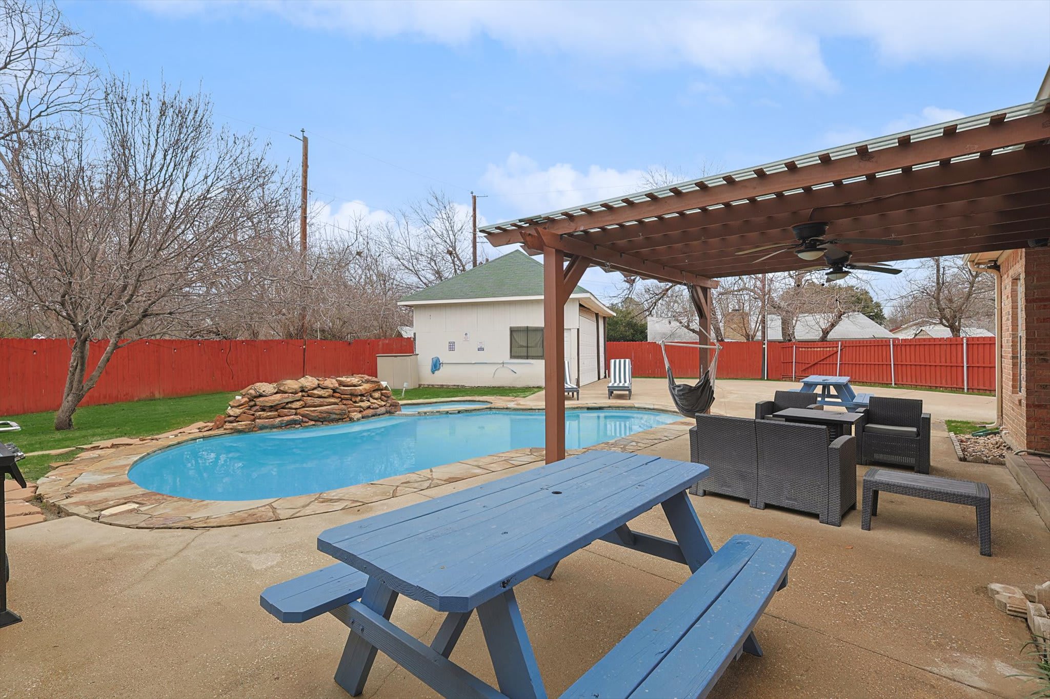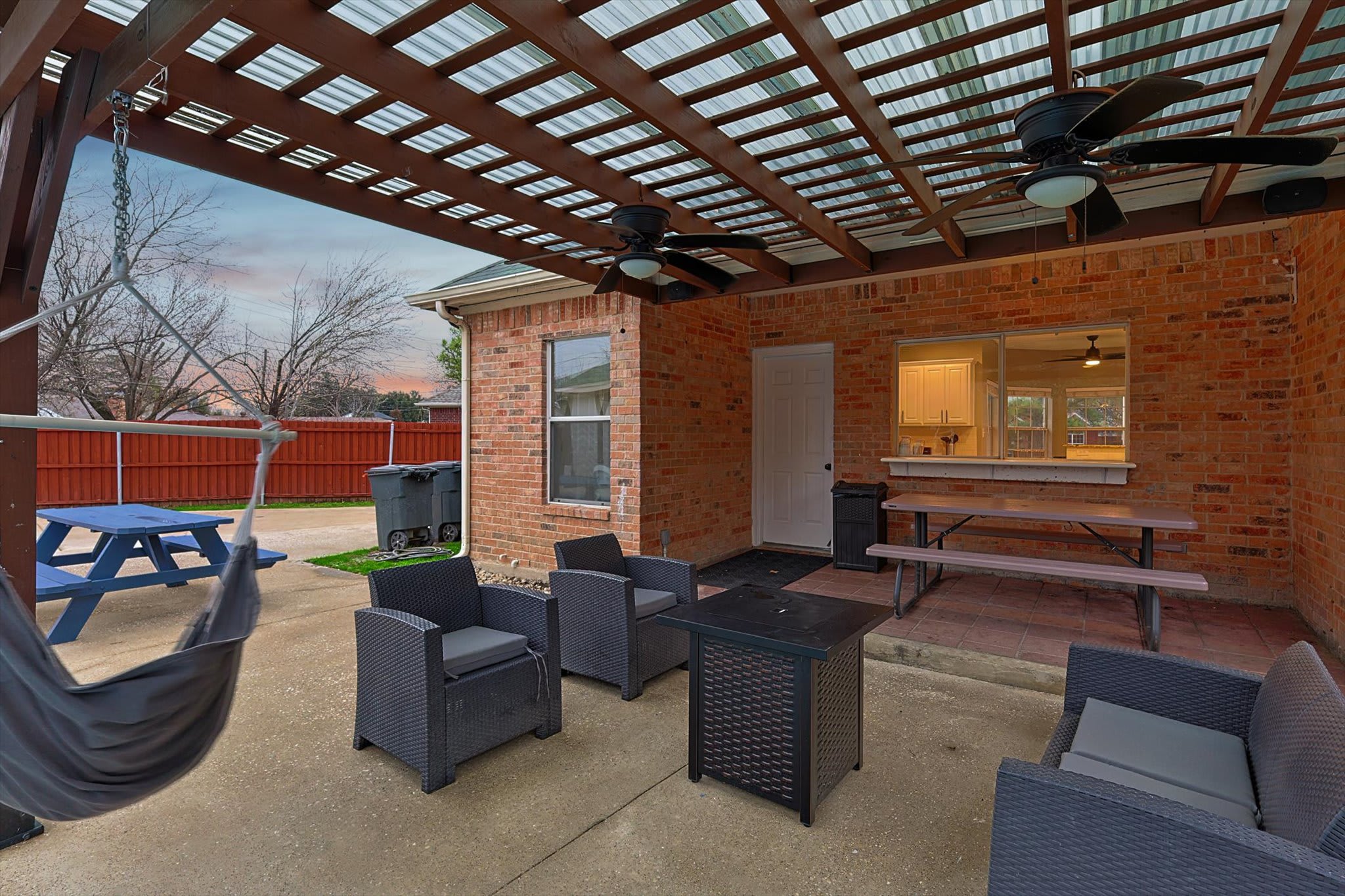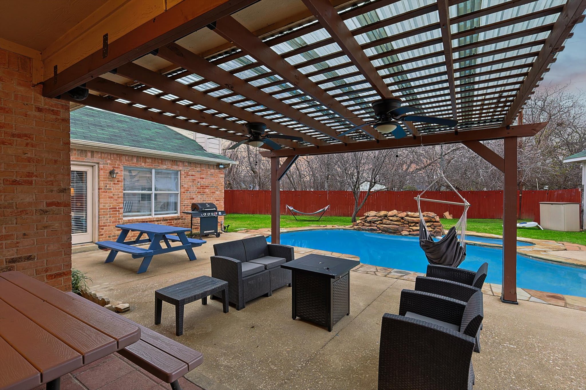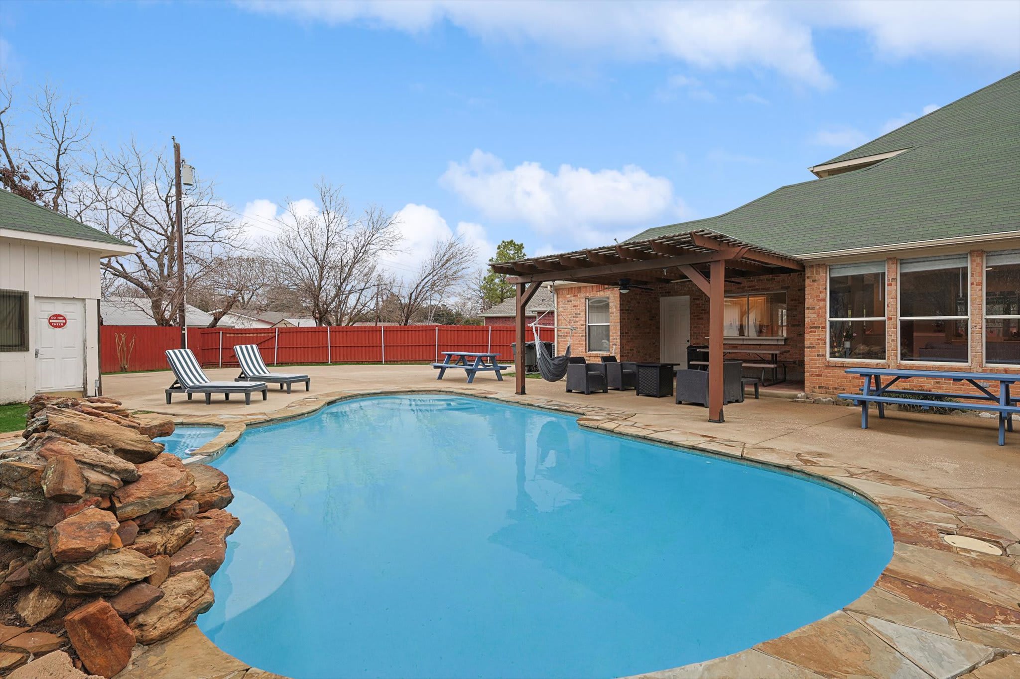 Beautiful 5-Bedroom, 2.5-Bathroom Modern Home with Pool & Patio This stunning home offers everything you need for a perfect getaway! Relax and unwind in the sunny, spacious backyard, featuring a large private pool, beautiful pergola, and plenty of sitting areas. Enjoy the covered patio, grill, and patio furniture—ideal for family gatherings or dinners under the stars. Inside, you'll find a bright and airy open-concept living space with cathedral ceilings, a cozy fireplace, and a fully equipped kitchen, making it perfect for preparing meals. The wet bar with glassware adds a touch of elegance, and with 3 HDTVs featuring cable and Apple TV, you'll have entertainment for everyone. Located in a fantastic Mid Cities area, this home is just a short drive from downtown Dallas (14 miles), AT&T Stadium (12 miles), and only a 10-minute drive to DFW Airport, making it the perfect base for your adventures. Our call center is available 24/7 during your stay to ensure you have a seamless experience!