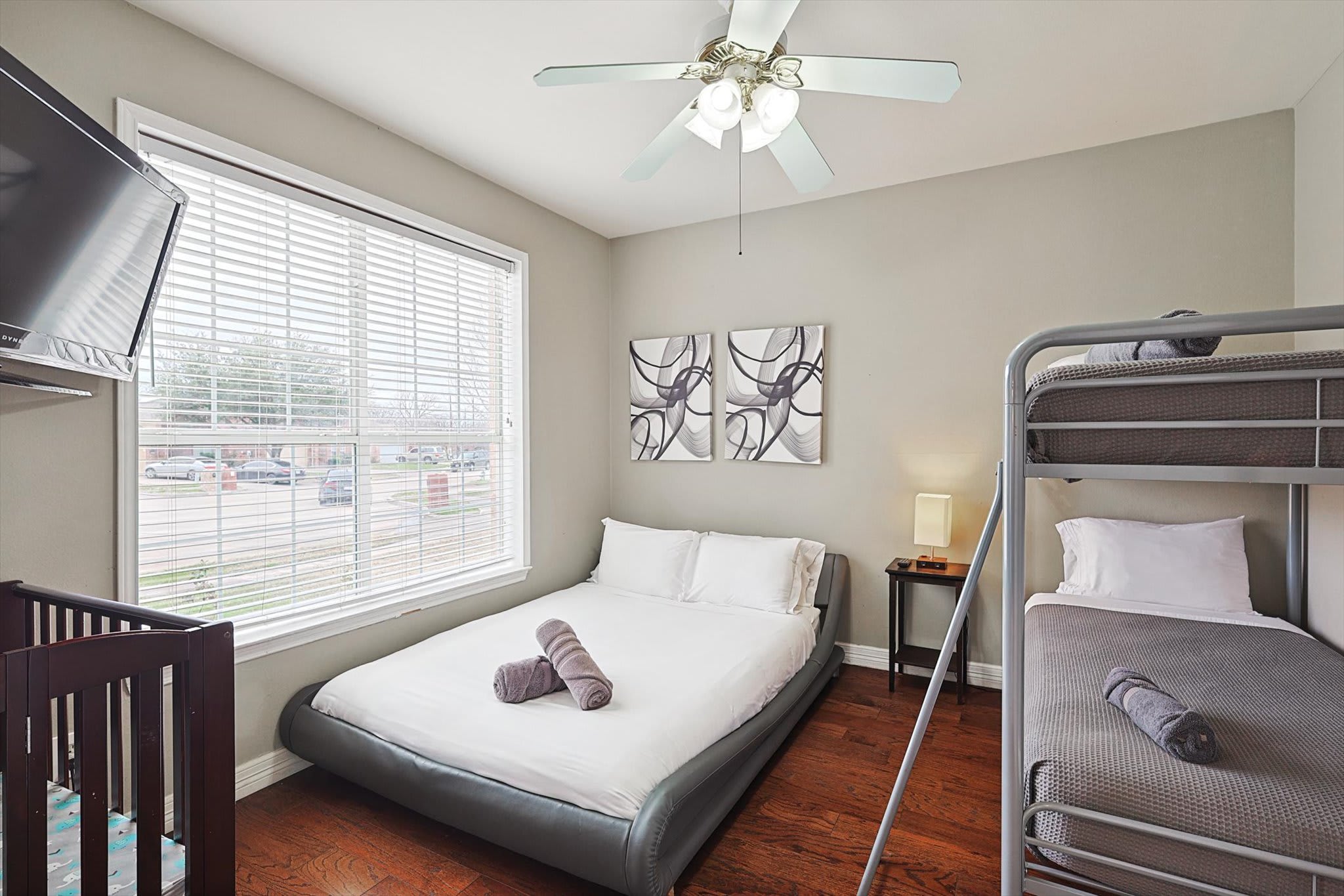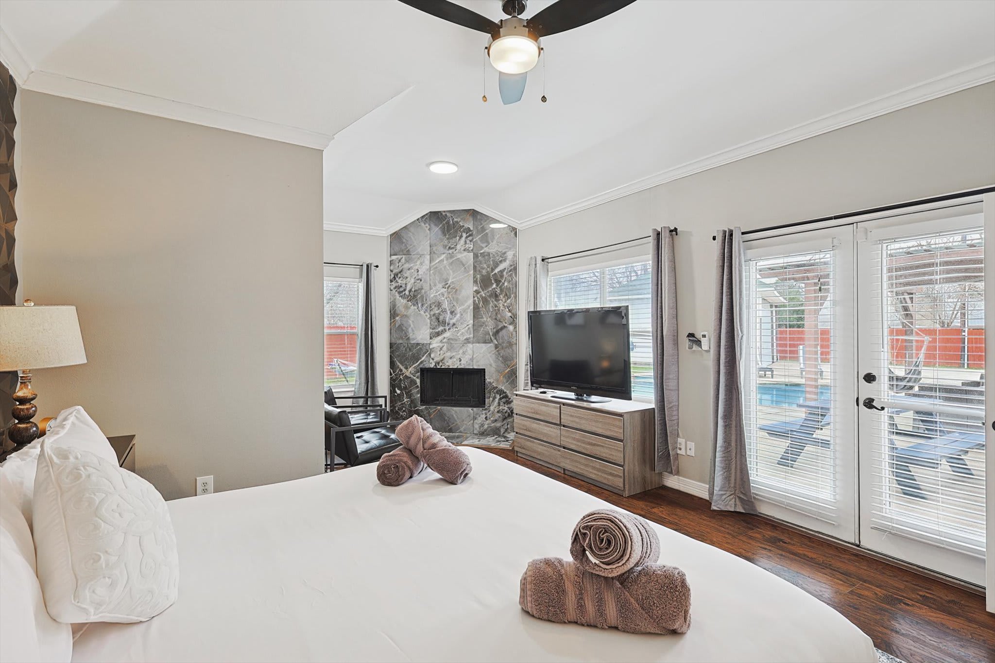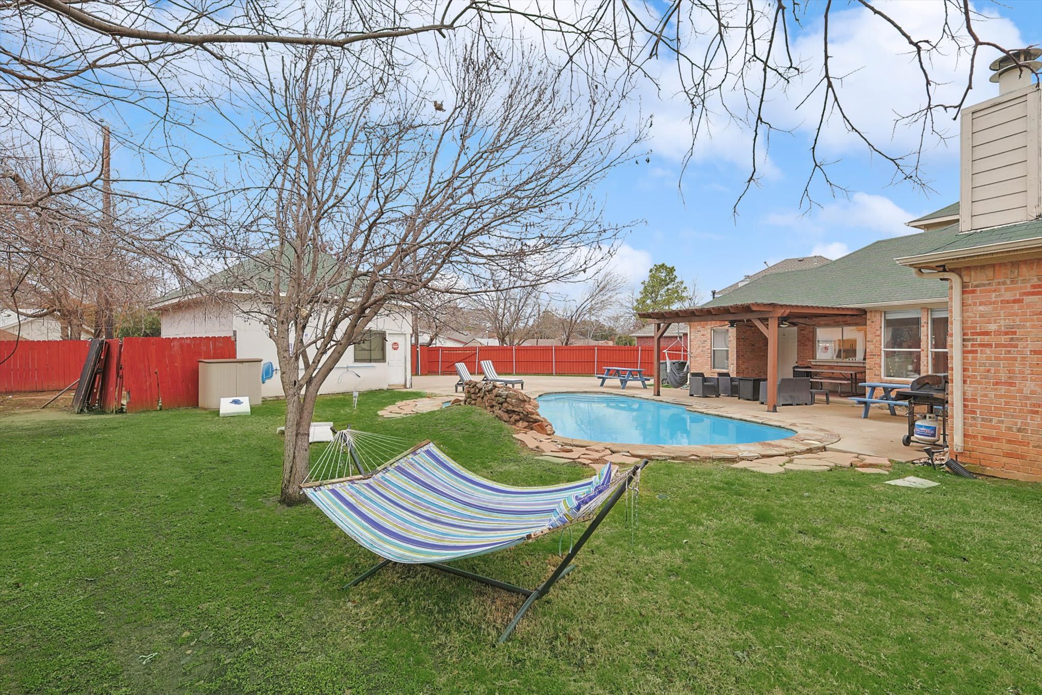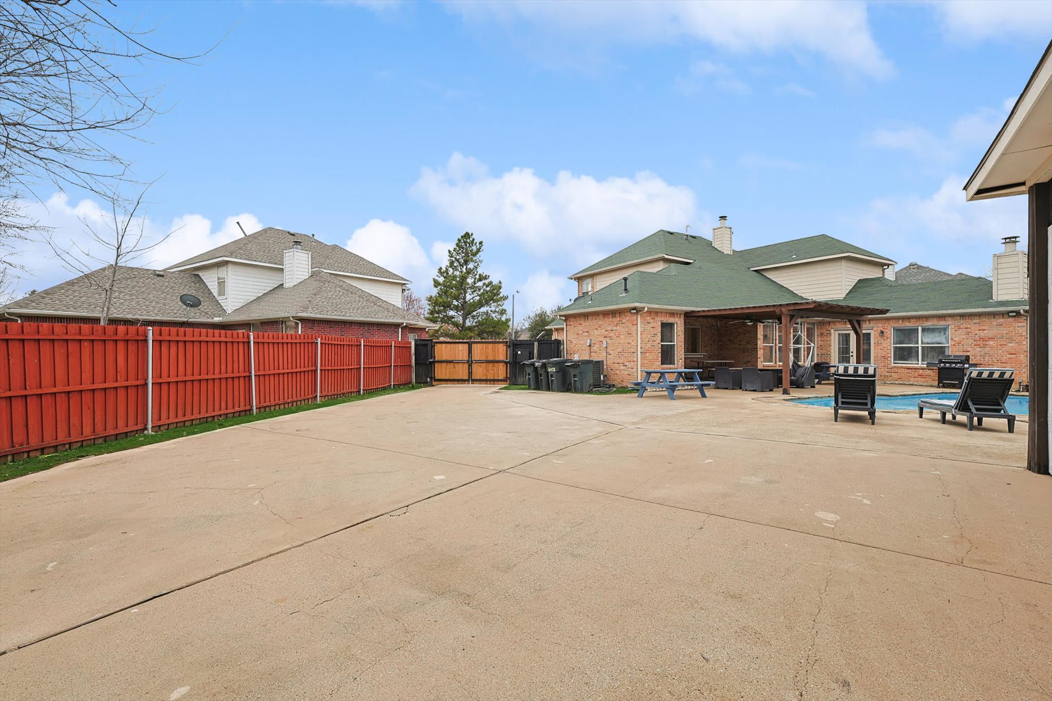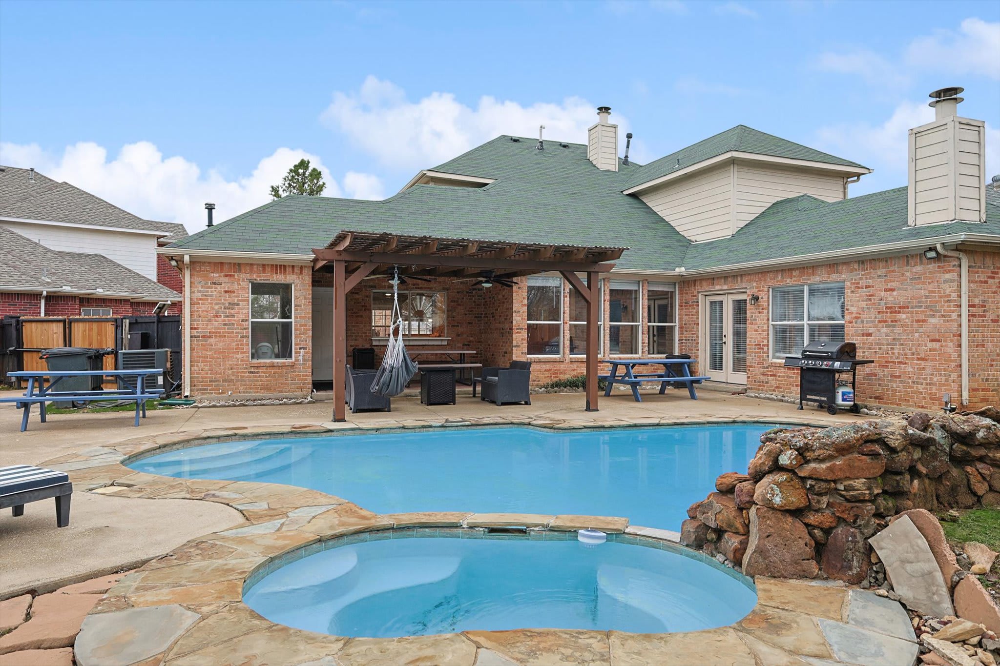 Beautiful 5-Bedroom, 2.5-Bathroom Modern Home with Pool & Patio This stunning home offers everything you need for a perfect getaway! Relax and unwind in the sunny, spacious backyard, featuring a large private pool, beautiful pergola, and plenty of sitting areas. Enjoy the covered patio, grill, and patio furniture—ideal for family gatherings or dinners under the stars. Inside, you'll find a bright and airy open-concept living space with cathedral ceilings, a cozy fireplace, and a fully equipped kitchen, making it perfect for preparing meals. The wet bar with glassware adds a touch of elegance, and with 3 HDTVs featuring cable and Apple TV, you'll have entertainment for everyone. Located in a fantastic Mid Cities area, this home is just a short drive from downtown Dallas (14 miles), AT&T Stadium (12 miles), and only a 10-minute drive to DFW Airport, making it the perfect base for your adventures. Our call center is available 24/7 during your stay to ensure you have a seamless experience!