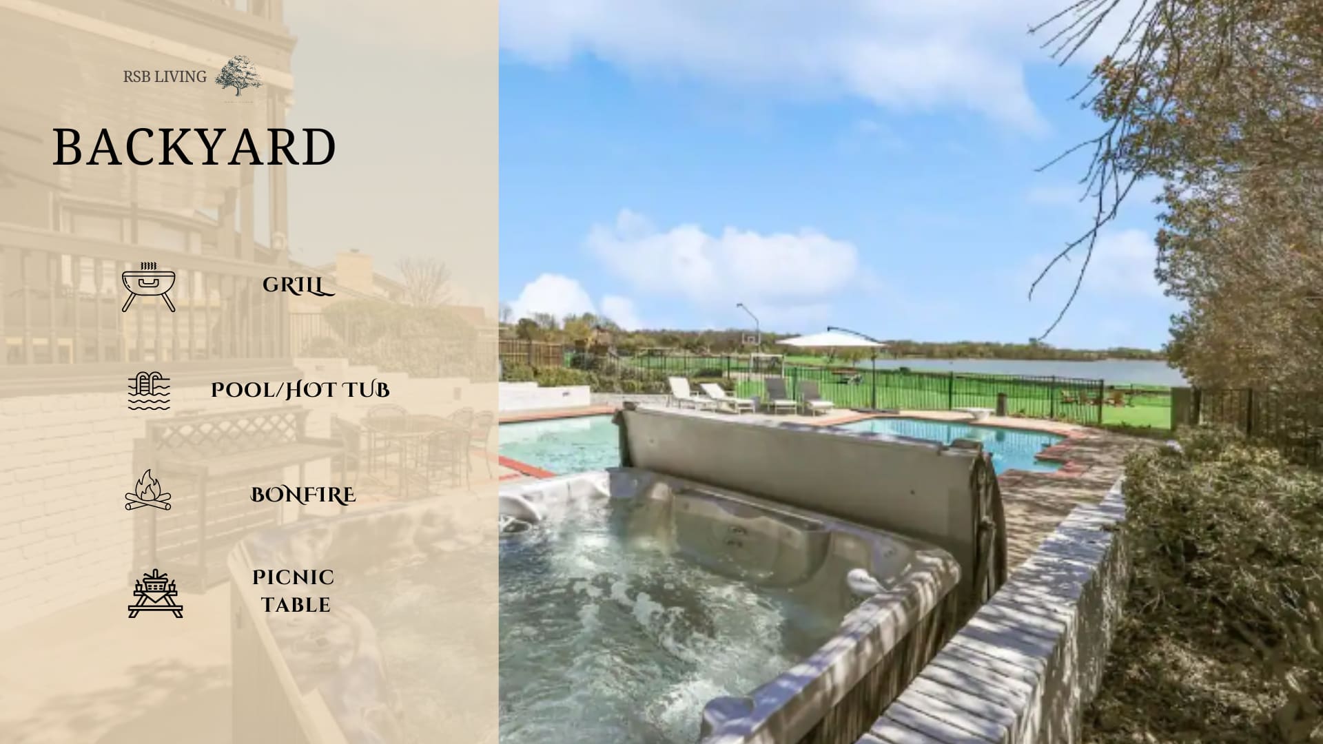 Enjoy the breathtaking water views and take a peaceful kayak ride right from the backyard. Soak up the sun in the oversized pool while taking in the serene lake scenery, or if it’s chilly outside, hop into the 8-seater outdoor hot tub by the pool for a cozy retreat.
